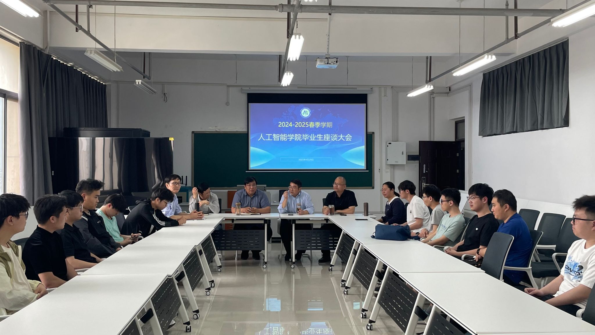 在龙湖校区三号组团楼A907室召开2025届毕业生就业座谈会,倾听学生心声,深入了解毕业生就业动态,进一步推进和部署毕业生就业工作。学院副院长杨关、张西广,直属党支部副书记张志鹏,辅导员姜茜,人工智能系副主任张慎武,以及刘军发、郑彬彬等教师代表出席会议。会议由张志鹏主持。