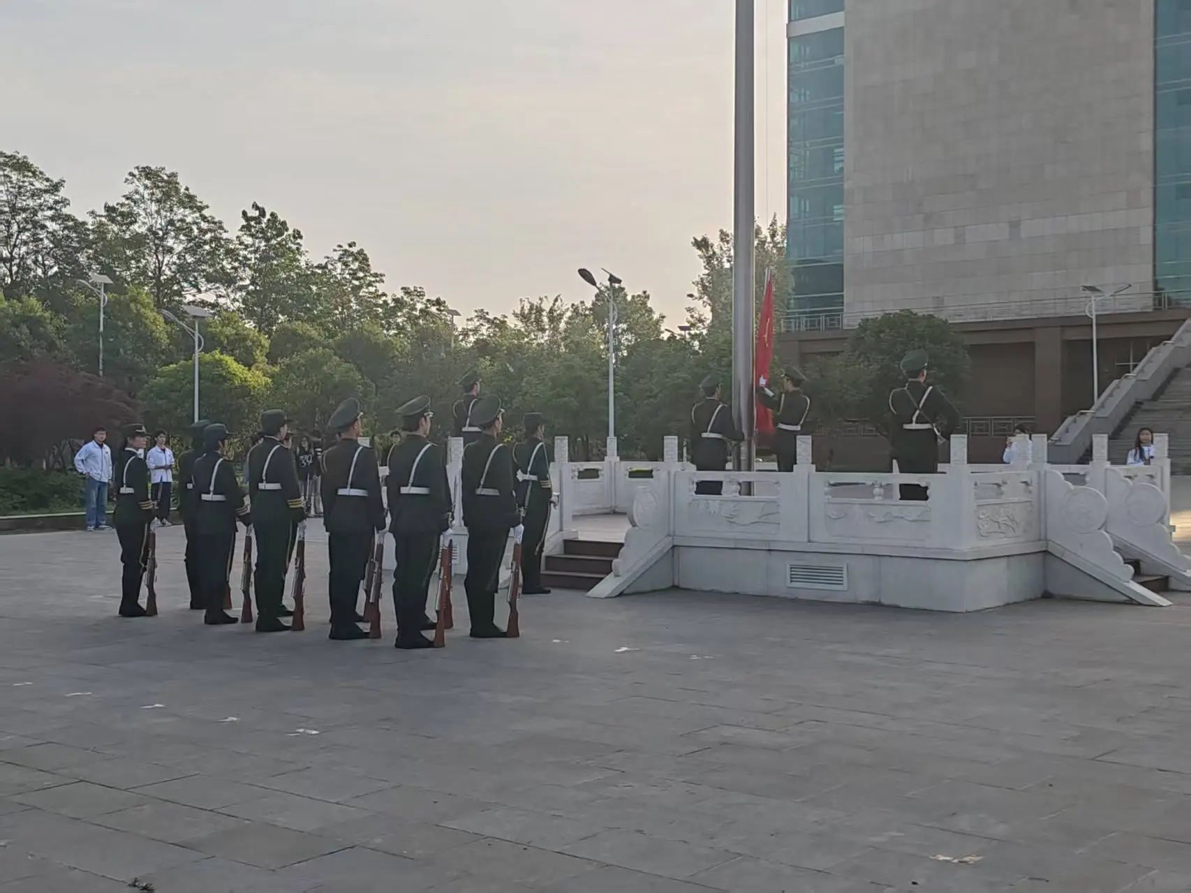 国旗飘扬,激扬青春使命7时整,升旗仪式正式开始。校国旗护卫队迈着铿锵步伐护送国旗入场,在嘹亮的国歌声中,五星红旗冉冉升起,全体师生肃立行注目礼,炽热的爱国情怀在晨光中激荡。