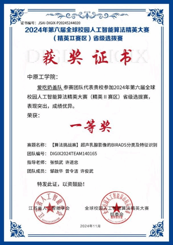 2022级学生邹啟华、曾令洁、许俊武组成的“爱吃奶盖队”(指导教师:张慎武、许进忠)在【算法挑战赛】超声乳腺影像的BIRADS分类及特征识别赛题中表现出色,以赛区一等奖同时获得国赛资格,最终以全国第8名的优异成绩获得国赛一等奖,创造学院历史最佳成绩。