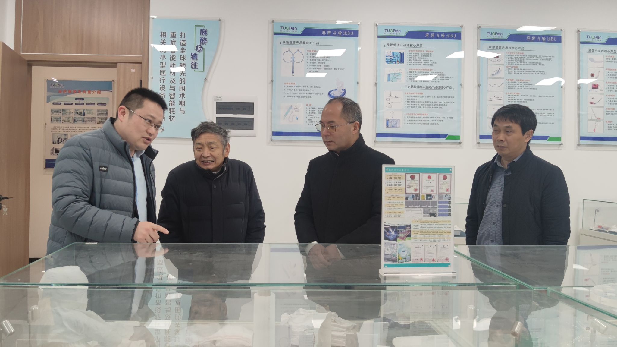 王国胜陪同夏元清一行参观了驼人(郑州)医疗科技产业园的技术成果展厅,详细回顾集团的发展历程,并介绍了集团在血液净化、智能可穿戴设备和麻醉护理等领域的核心技术突破及产业布局。